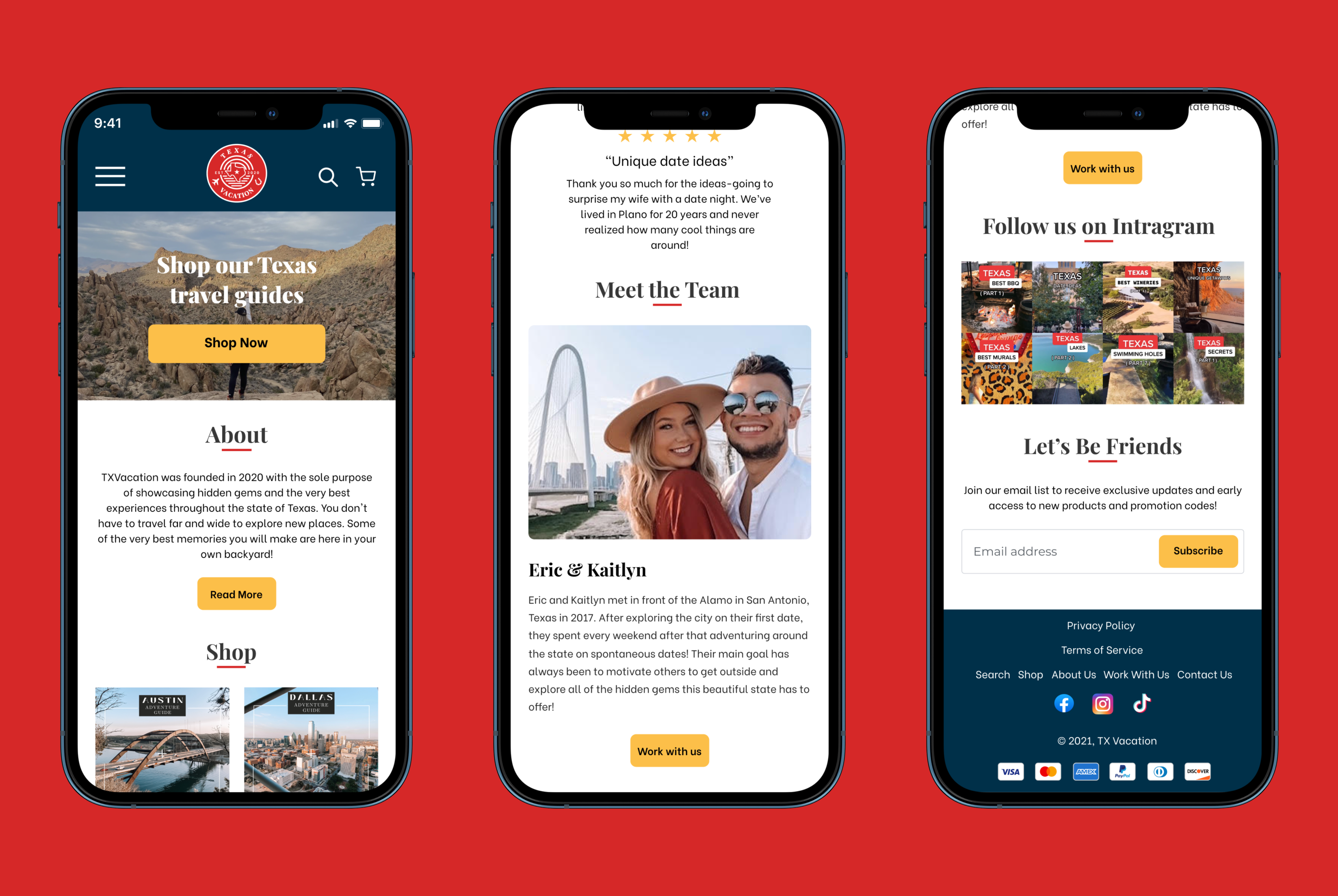 TXVacation has a strong following of young men and women on social media who love their recommendations that they post. TXVacations’ social posts and bio link to their website where they sell more in-depth digital travel guides, but they need help driving sales of the guides and showing their value. They also partner with businesses in Texas that they post about or include in their guides, however, they do not have an online process for businesses to reach out about partnerships.