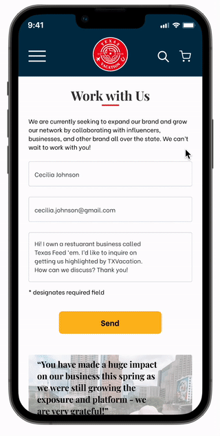 Users had a hard time finding the work with us page as it was listed in the hamburger menu as “Business Inquiries”. Once they did find it, they weren’t sure what the purpose of this page actually was. So, we changed the name of the page and added in important content from TXVacation’s business partnerships pdf to the online page and form.